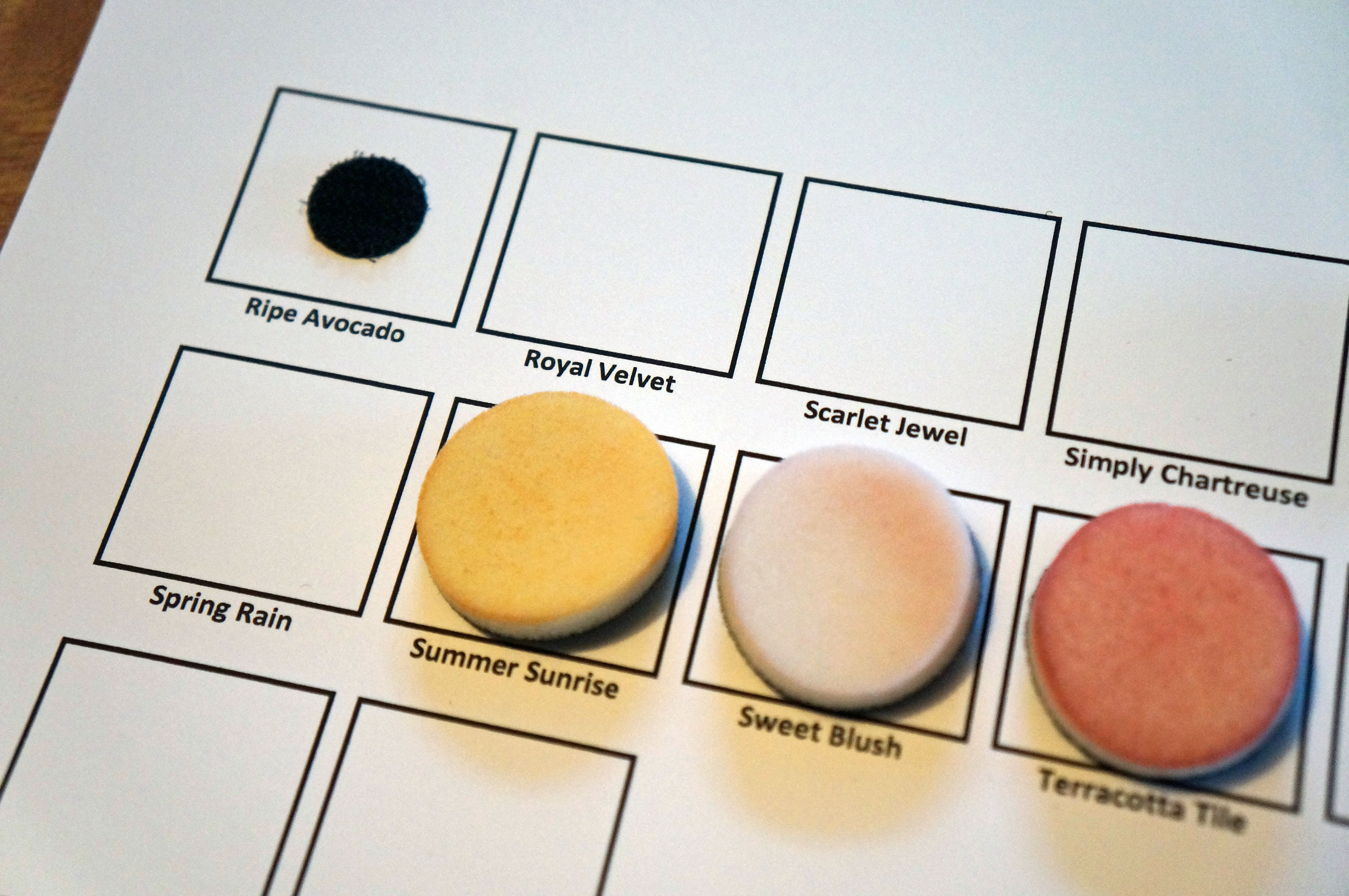 I created an excel spreadsheet (yes, I’m a nerd but I’m not going to lie, I love excel spreadsheets) with the names of all the PTI colors and made squares big enough to fit a piece of foam and made it into a PDF which you can download here: PTI Blending Foam Outline. I bought some Scotch velcro dots to place in each square to hold the foam in place.