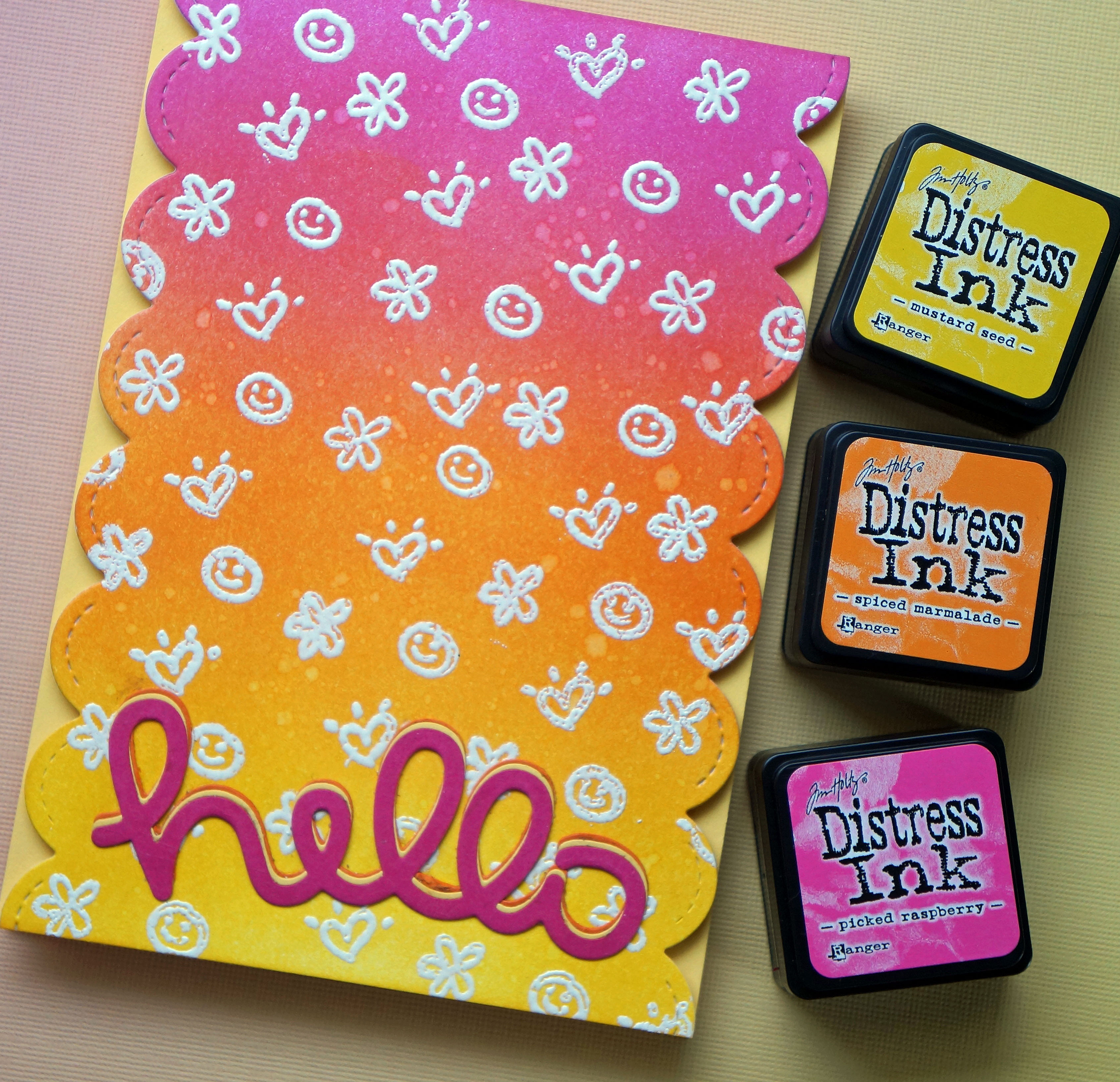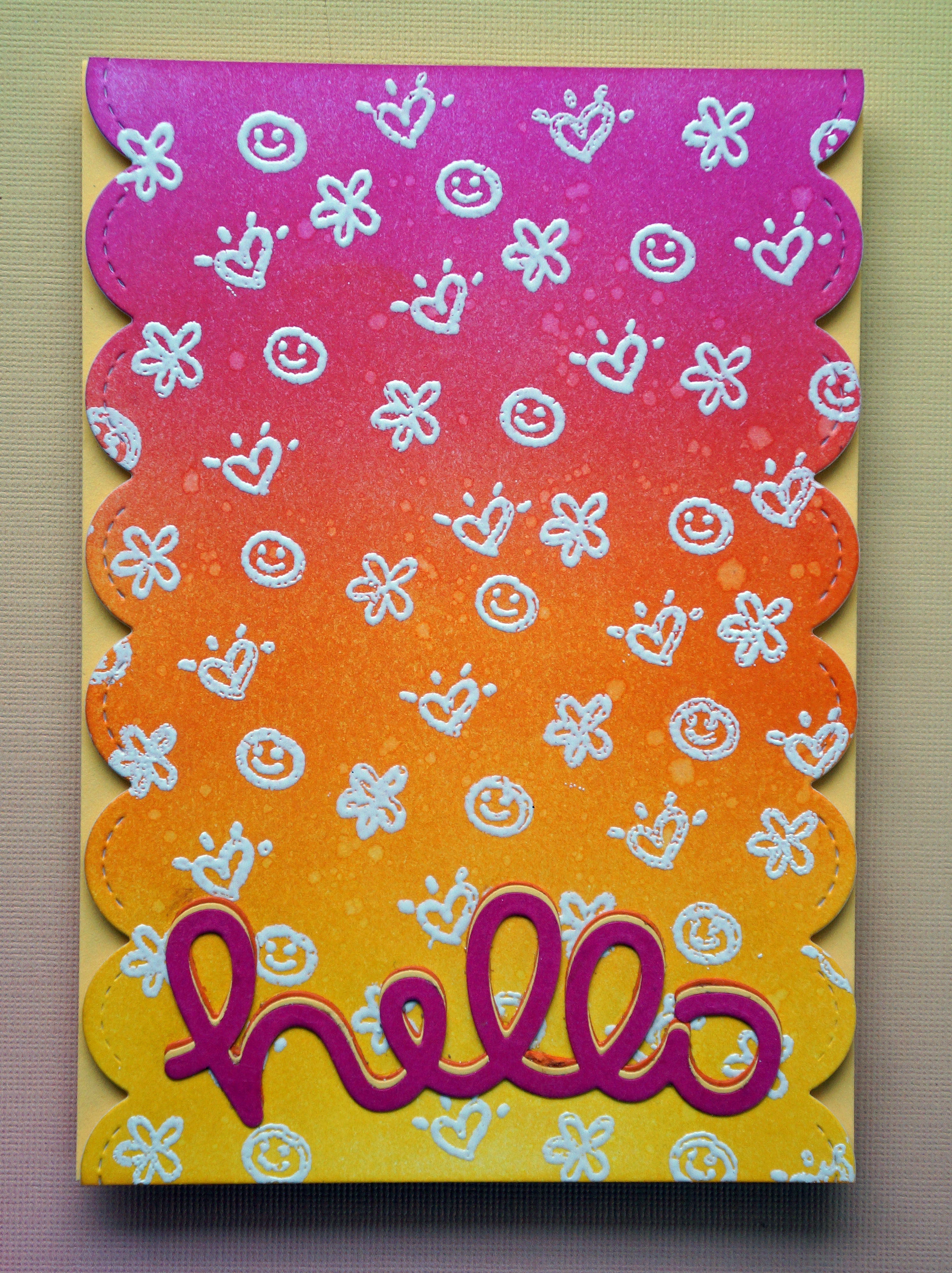 I created the background with the distress inks, and used white embossing powder for the pattern. I cut the sides with Lawn Fawn’s Stitched Scallop Border and the sentiment with Scripty Hello in three different colors. The background was then added to the card with foam tape.