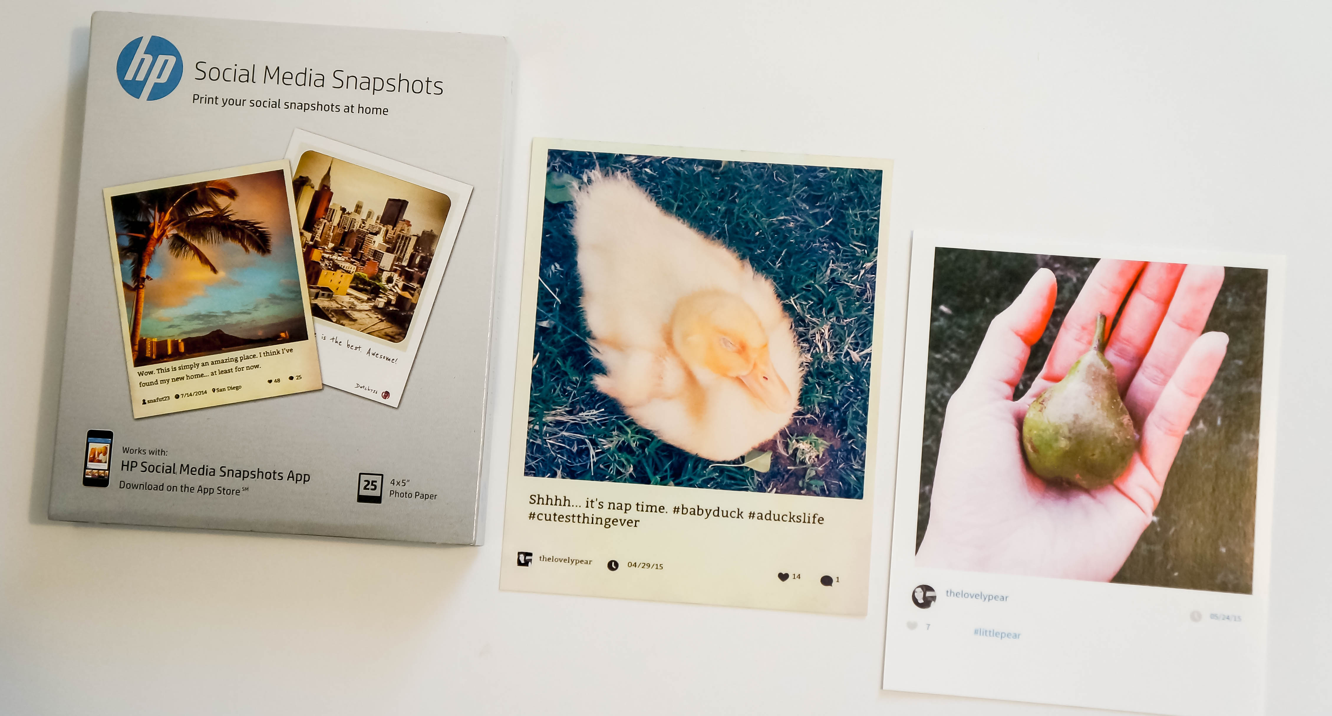 If you love Instagram as much as I do, then you HAVE to try this out! You buy this pack of HP photo paper, which is 25 sheets of 4×5 glossy paper, and you download the HP Snapshots app (only available on Apple App Store). Once you connect to your Instagram account and your HP printer, you can choose an Instagram photo and a template and you get this picture with your Instagram stats. You can have your photo caption, the date you posted it, your icon, and how many likes and comments your photo received printed. There are 11 different templates to choose from, including some that come with a black, green chevron, or pink border. The duck photo was printed with an antique looking template called “Dickens”. I think this would be perfect to use with Project Life or scrapbook layouts.