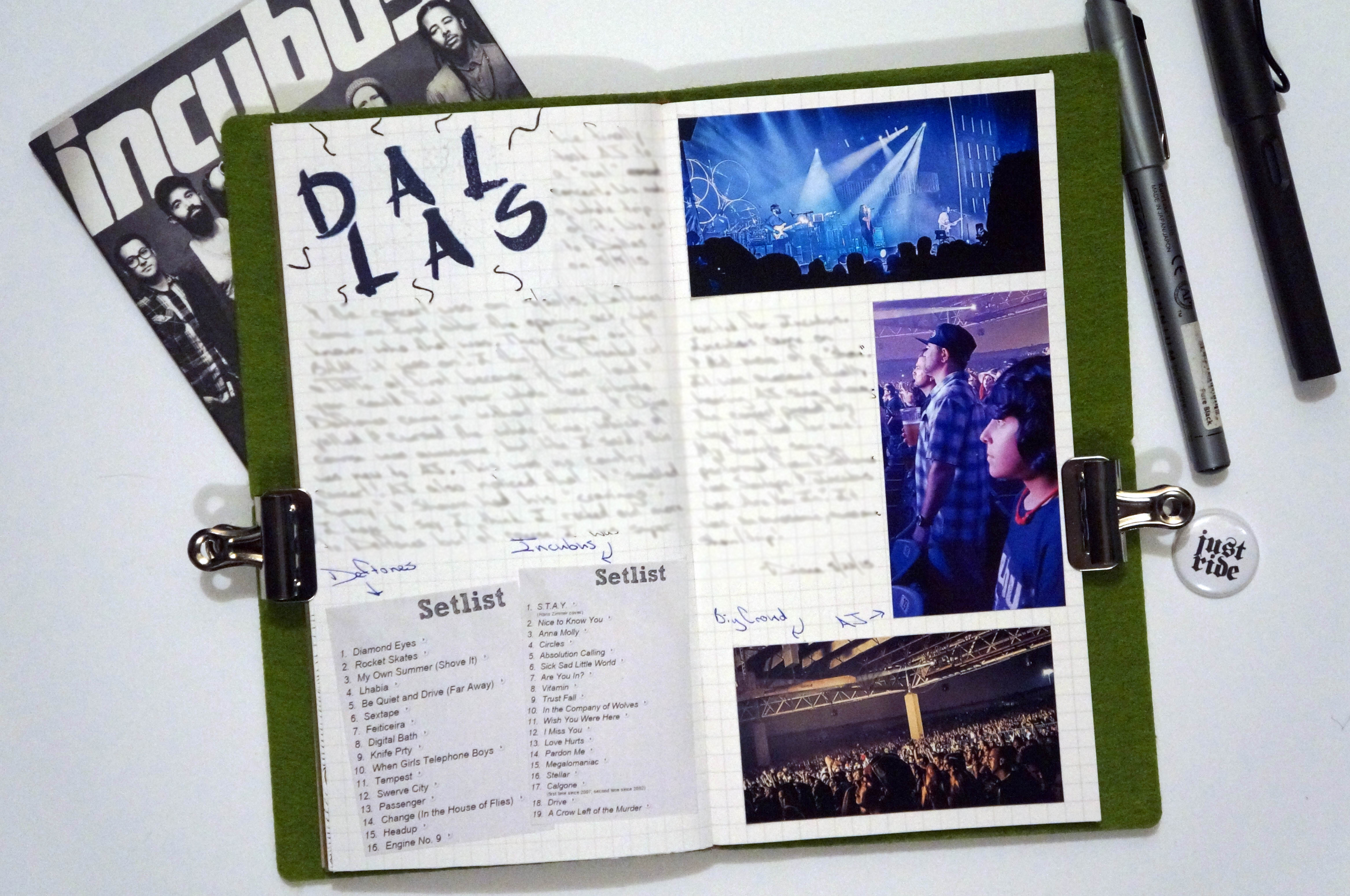 My family and I recently got back from a little vacation we took to Dallas, TX. We had such a blast and I really wanted to journal about a concert we went to. I printed a couple of pictures and I went online to find the concert set list and added those to this spread. I used Studio Calico’s Mia Alpha stamp set on here, along with my new Lamy pen (insert lovey-dovey eyed emoticon here, I LOVE my Lamy pen).