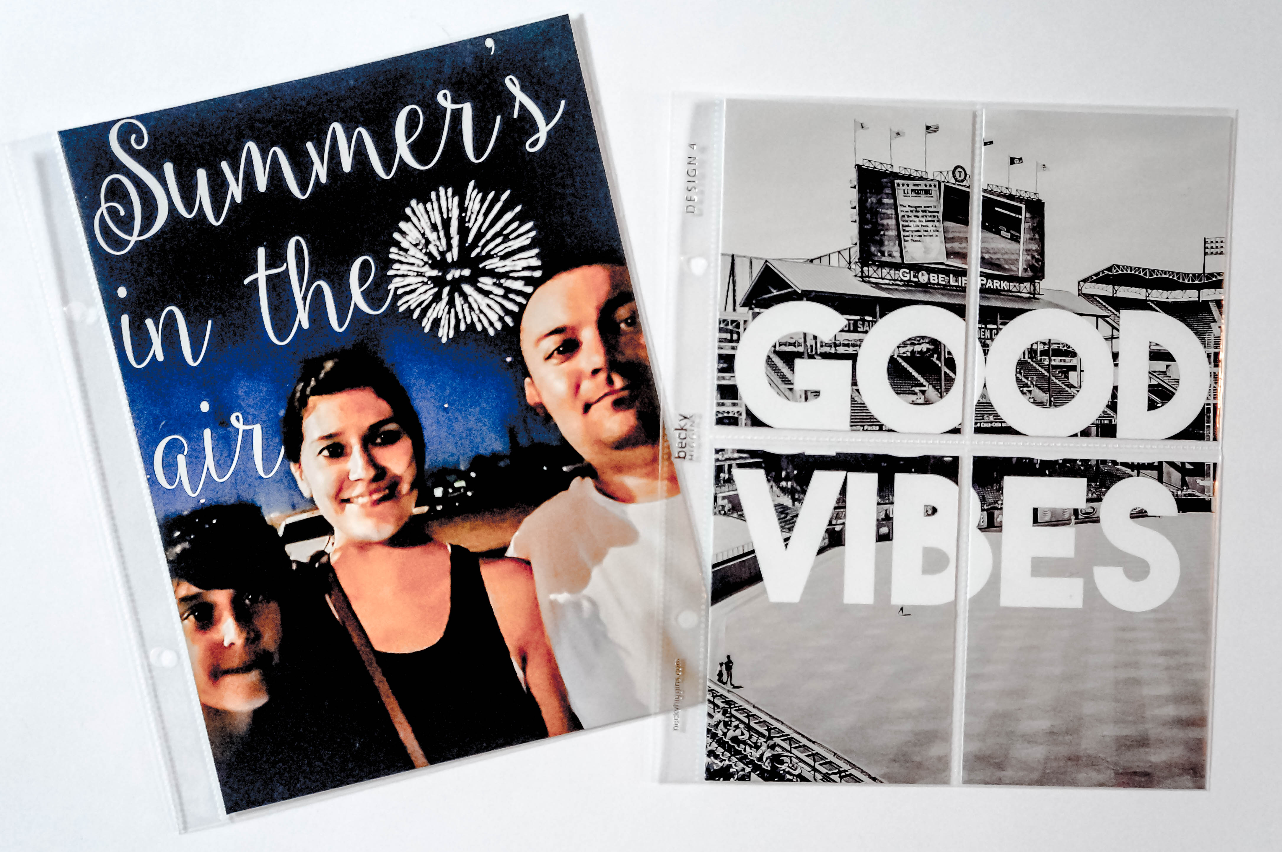 I had a lot of fun with this two layouts. I normally don’t add any words on my pictures with Photoshop, I prefer to stamp, but I’ve been seeing a lot of “digital” stamping and wanted to try it for myself. I added sentiments to two pictures I took during the summer, one from Fourth of July, and the other from our Dallas vacation.