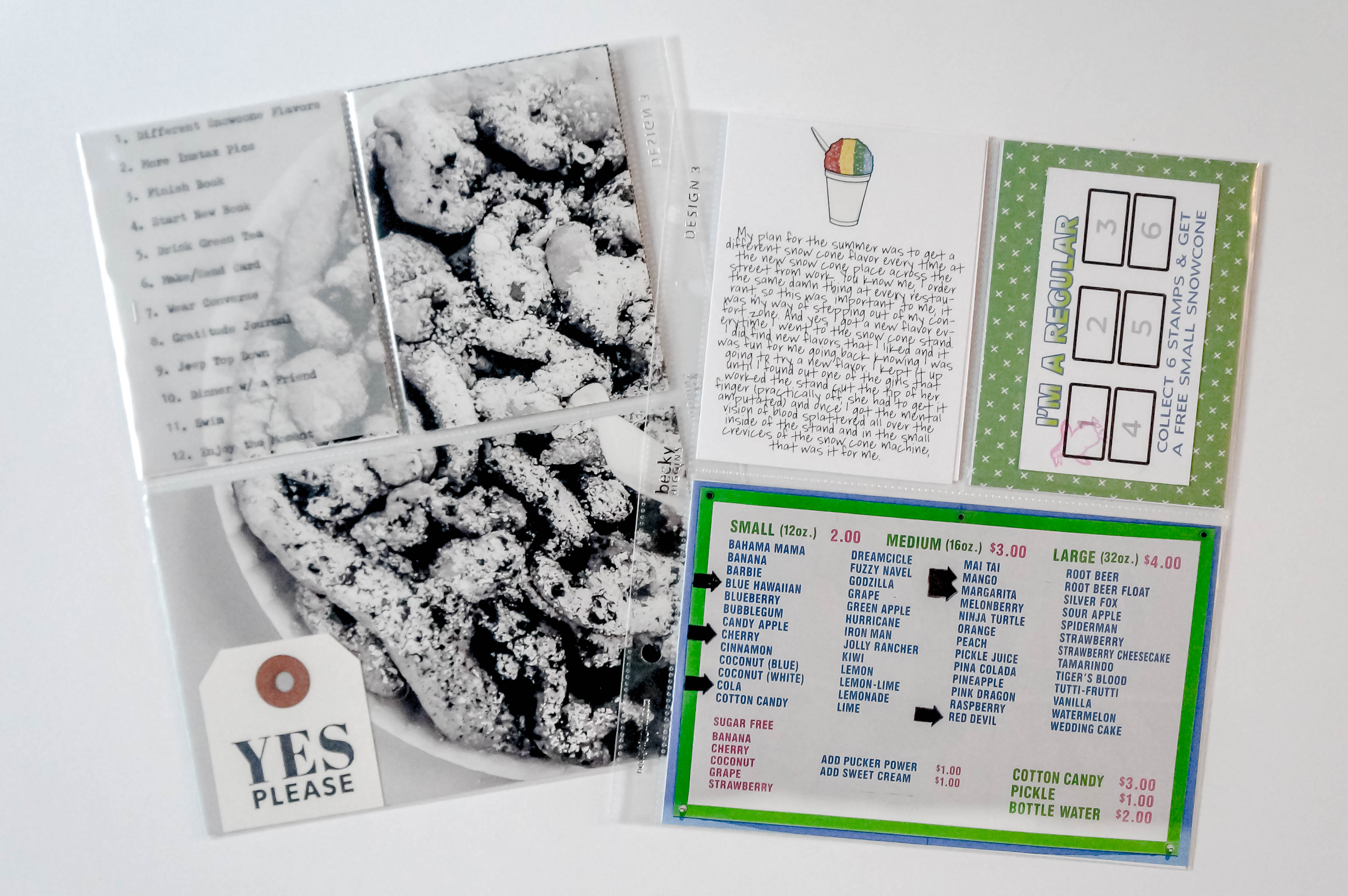 I typed out my 12 goals on vellum paper and made the whole layout with a picture I took with my phone of a funnel cake. Layouts like this are my favorite and I would’ve done every page like this but, come on, I had to change it up!