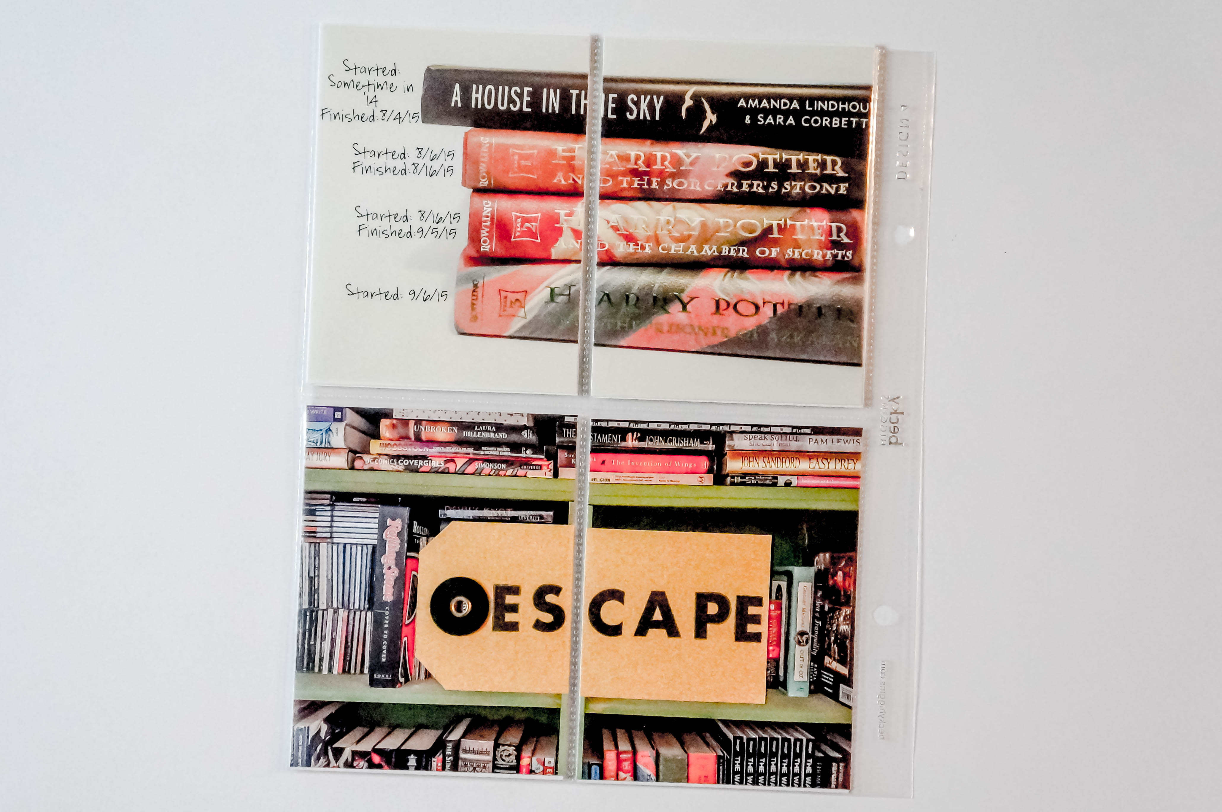 I took a picture of the books and added the dates I started them and finished them with Photoshop. I also took a picture of my “library” and stamped on a Studio Calico parcel tag using a Kellie Stamps alpha set.