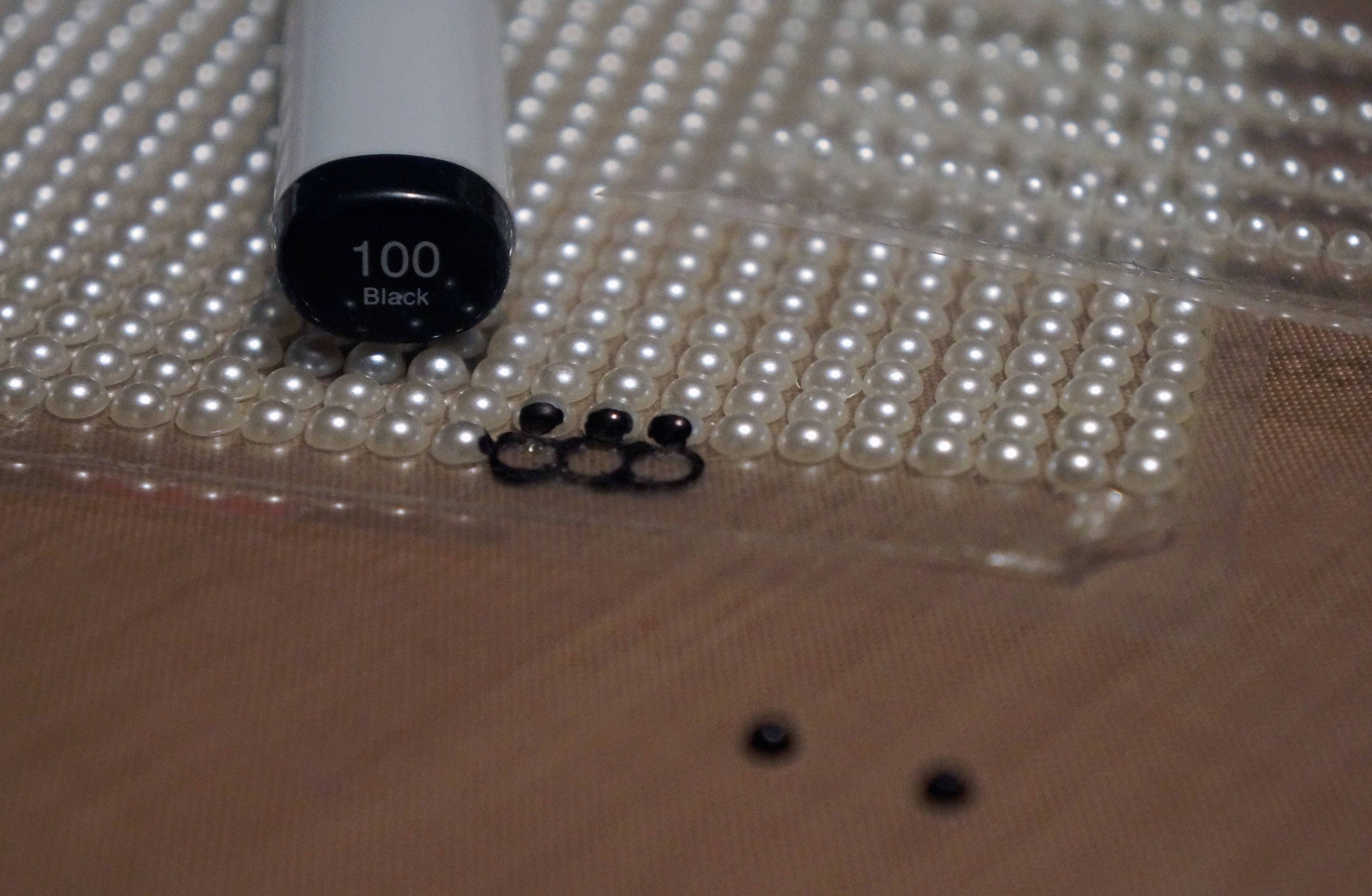 I wanted to add some enamel dots but unfortunately I haven’t bought any, so I used some pearl dots(?). I colored a couple with a black Copic marker to match the card.